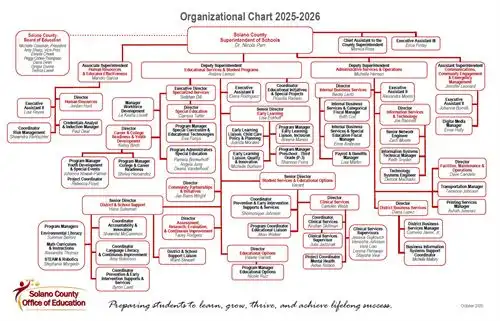 The elected Solano County Superintendent of Schools is a State Constitutional Officer who serves as an intermediary between local school districts and the State of California. The county superintendent provides leadership, support, and state-designated fiscal and program oversight of all school districts in Solano County. Additionally, the county superintendent is responsible for visiting and examining each school at reasonable intervals to observe their operations; approving or disapproving each school district’s Local Control and Accountability Plan (LCAP) and budget; and conducting a yearly audit of school districts’ assignments/misassignments of certificated staff. The county superintendent also serves as the Chief Executive Officer of the Solano County Office of Education (SCOE) providing oversight for all internal operations including business, human resources, transportation services, and the programs operated by SCOE including, but not limited to, Juvenile Court and Community Schools (JCCS), student wellness, specialized services such as special education under contract with the Special Education Local Plan Area (SELPA), workforce development, career technical education and career and college readiness, and educational services such as professional learning and early learning programs and supports.